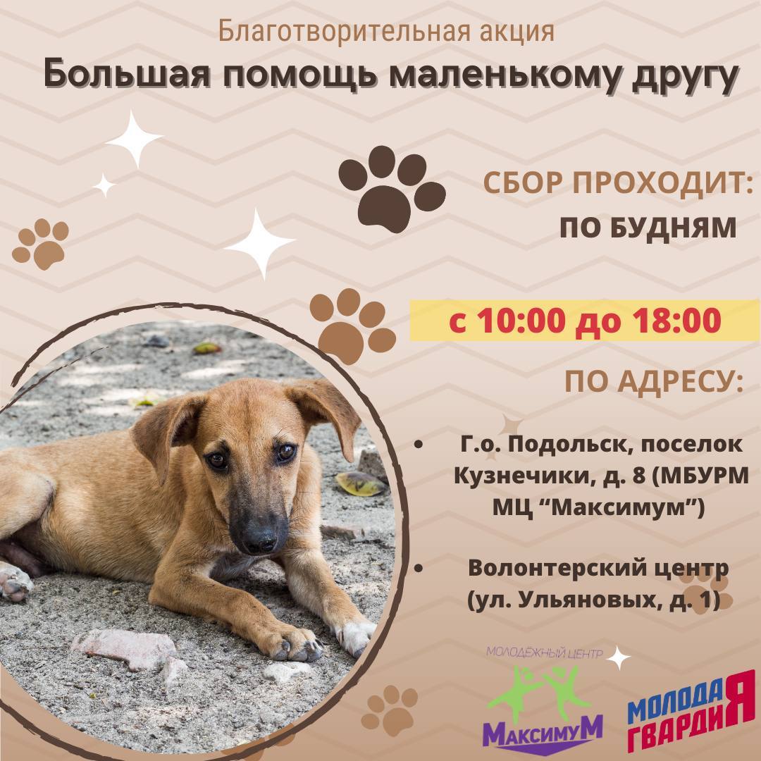 Подольское отделение «Молодой Гвардии» запускает акцию «Большая помощь маленькому другу» по сбору кормов для животных.