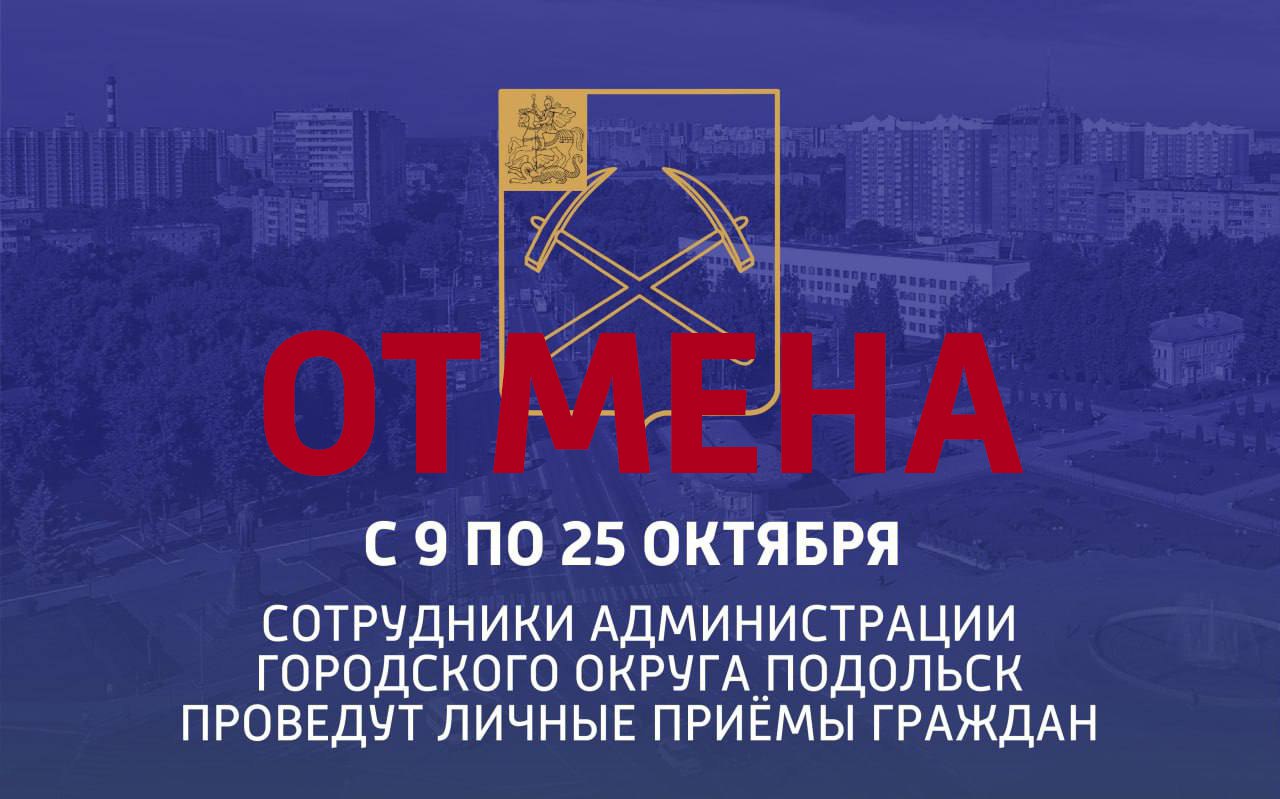 Уважаемые подольчане! Сегодня, 11 октября, с 10:00 до 17:00 личный приём в поселке Железнодорожном ОТМЕНЁН. Завтра, 12 октября, с 10:00 до 17:00 личный приём в микрорайоне Львовском ОТМЕНЁН. Источник и фото: «Официальный Подольск»