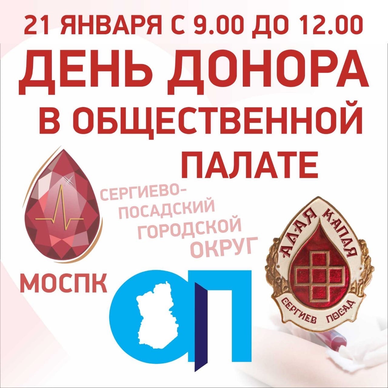 21 января с 9.00-12.00 в Общественной палате Сергиево-Посадского городского округа состоится совместная донорская акция «Алая капля».