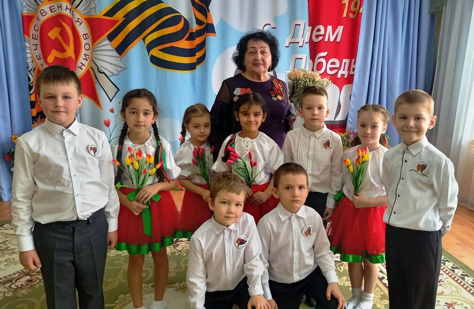 Нарядно одетые малыши со своими воспитателями приняли участие в праздничном концерте, на котором исполнили песни военных лет.