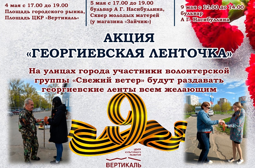 4, 5 и 9 мая участники волонтёрской группы «Свежий ветер» ЦКР «Вертикаль» будут раздавать на улицах города георгиевские ленты.