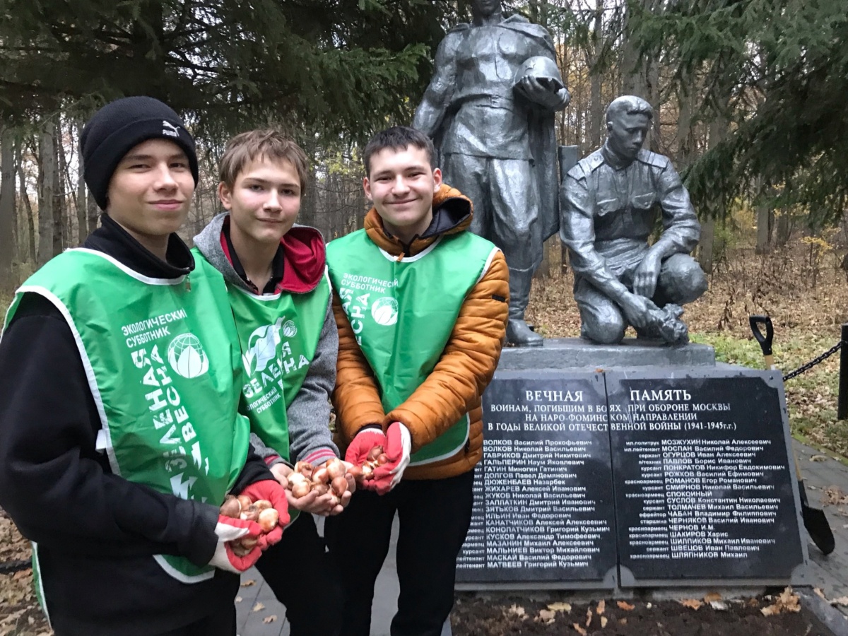 На братской могиле воинов 33-й армии, погибших при обороне Москвы в 1941 году, ребята высадили луковицы тюльпанов, которые расцветут следующей весной, к 80-летию Великой Победы. Тюльпаны на зиму бережно укрыли листвой.