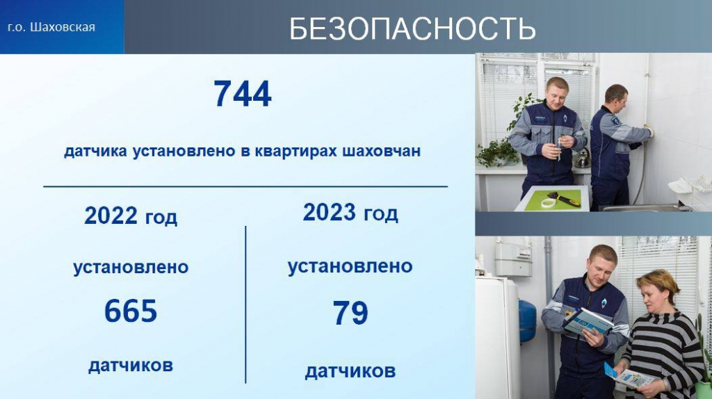 744 датчика контроля утечки газа установлено в квартирах округа. Вопросам газовой безопасности Губернатор Андрей Воробьёв уделил особое внимание на еженедельном совещании с руководящим составом Правительства. По поручению Губернатора в городском округе Шаховская ведется активная работа по установке датчиков загазованности: в 2022 году 665 квартир оснастили такими датчиками, еще более 70 установили в этом году.Также в связи с изменениями в федеральном законодательстве с 1 января 2024 года Подмосковье перейдет на новую модель газового обслуживания: единой обслуживающей организацией станет «Мособлгаз». На сайте «Мособлгаза» ( https://mosoblgaz.ru/ )будет опубликован график техобслуживания. За 20 дней до старта работ жителям отправят электронные письма с датой проведения ТО, а управляющие компании разместят объявления на придомовых информационных щитах.