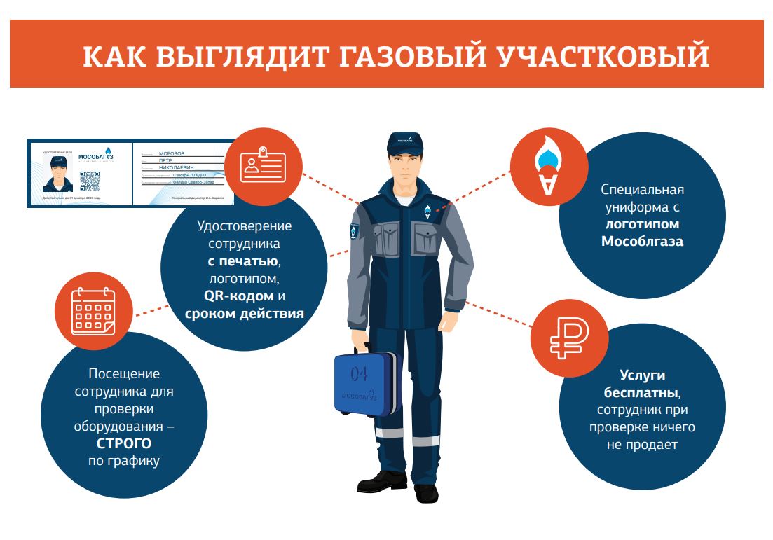 3. Сотрудники Мособлгаза всегда одеты в корпоративную форму, при себе имеют удостоверение и бейдж с QR-кодом. Отсканировав QR-код с личной карточки, можно увидеть подробную информацию о специалисте.