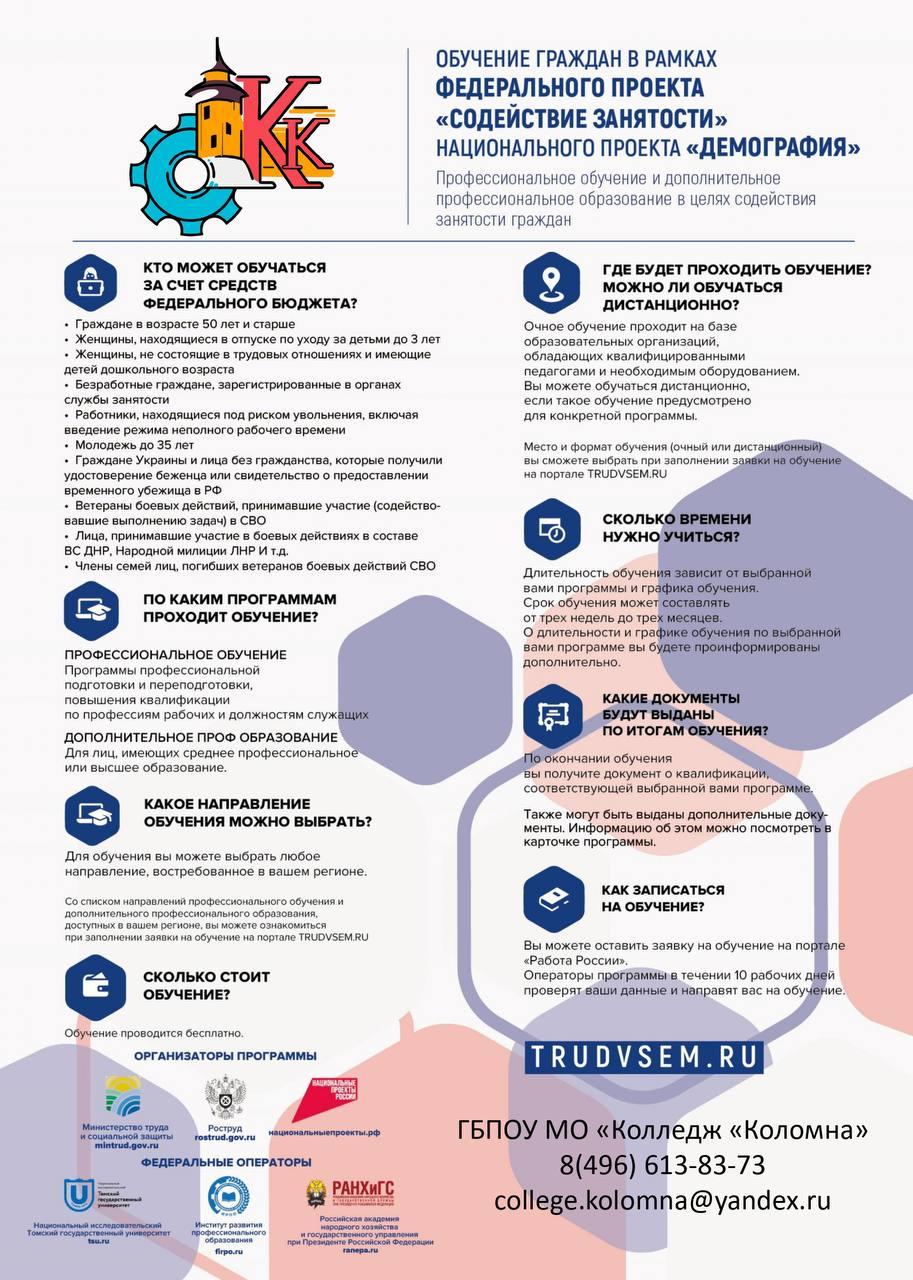 Колледж «Коломна» проводит обучение в рамках федерального проекта «Содействие занятости»