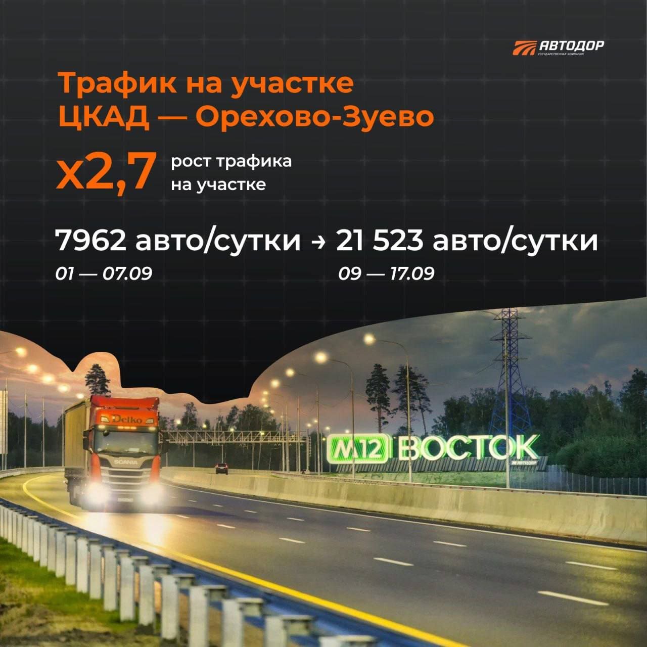 Выросла интенсивность трафика и на открытом в сентябре 2022 года участке от ЦКАД до Орехово-Зуева. После открытия новых участков трассы, с 9 по 17 сентября, трафик вырос до 21 523 авто в сутки.