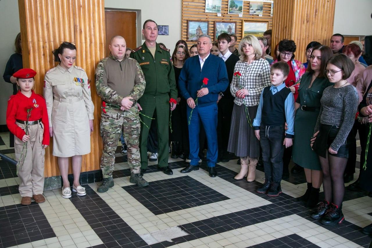 На открытие стенда пригласили родных и близких Героя – маму Елену Николаевну, супругу Наталью Михайловну и детей Василису и Матвея.