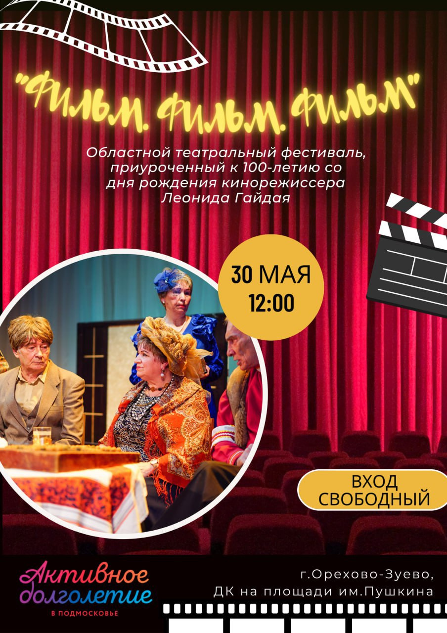 В рамках фестиваля в Орехово-Зуеве покажут театральные постановки — сцены из полюбившихся советских фильмов режиссёра. Актёры — участники областной программы «Активное долголетие» из Реутова, Ногинска, Ивантеевки, Ступина, Домодедова, Талдома и Орехово-Зуевского городского округа.