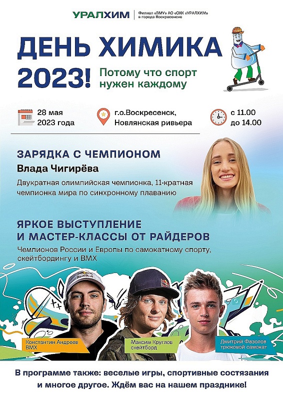 28 мая Воскресенск отметит День химика. Приглашаем жителей и гостей округа на спортивный праздник, который состоится в микрорайоне Новлянский с 11.00 до 14.00.