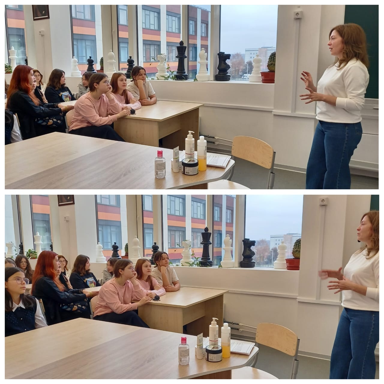 Девочки получили практические советы по защите кожи, использованию косметических средств, разобрались, что делать с проблемной кожей, в чем вред окрашивания волос, как питание и вредные привычки влияют на внешний вид, какие правила необходимо соблюдать при использовании индивидуальных косметических принадлежностей. Ирина Владимировна ответила на вопросы обучающихся.