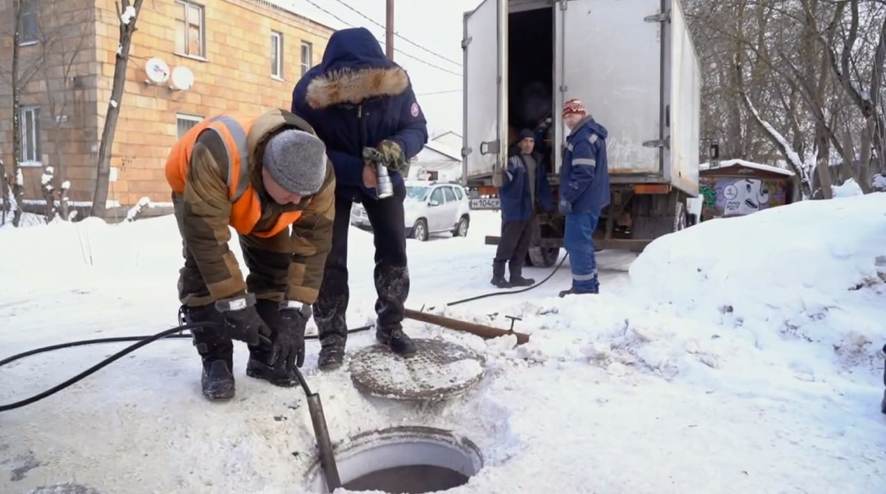 Несмотря на сильные морозы техника и люди работают. Динамика есть. Сейчас сотрудники ГУП МО «КСМО» промывают внешние сети, чтобы ускорить процесс отвода стоков.