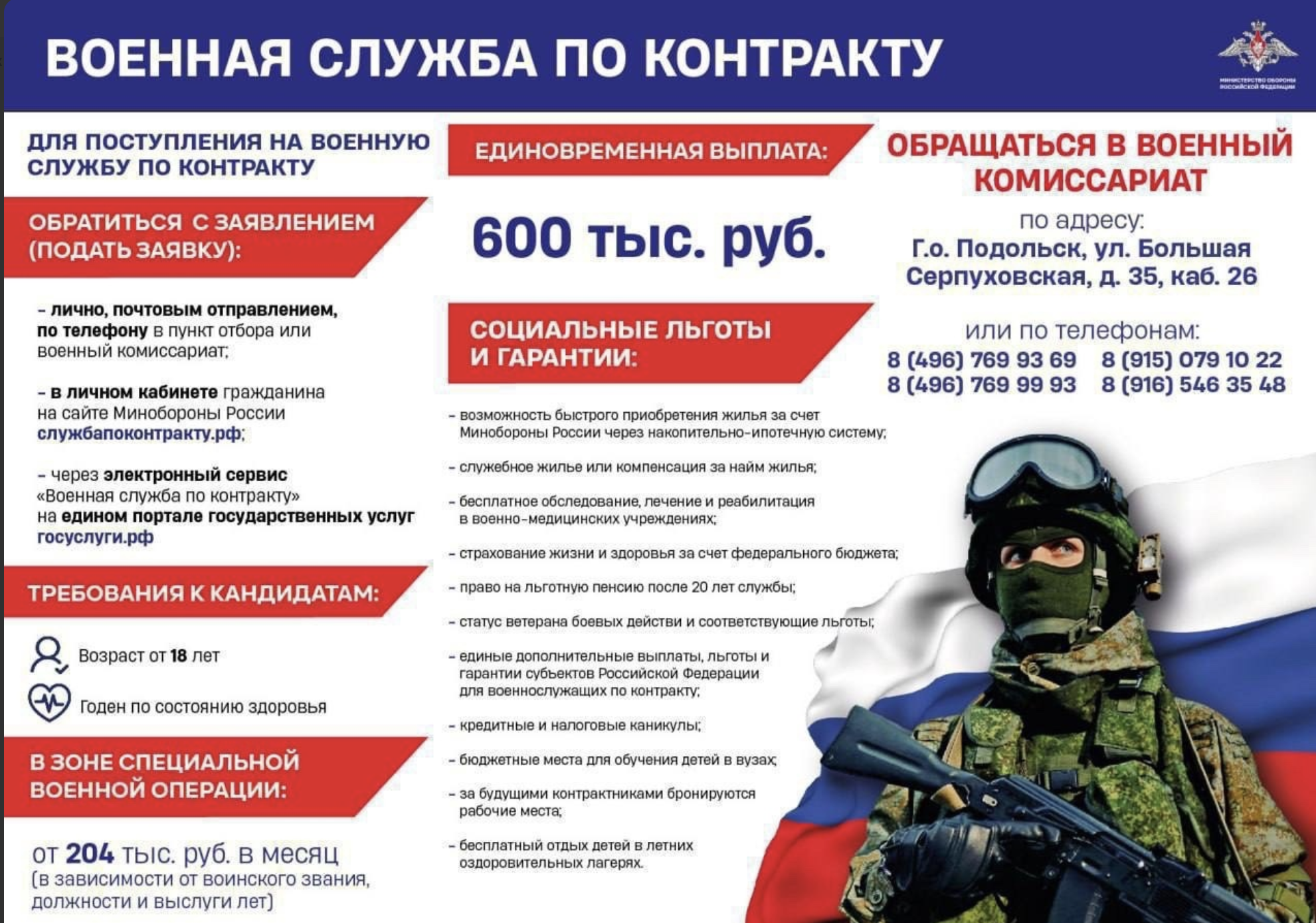 Продолжается прием на контрактную службу в армию России. Полную информацию о требованиях к состоянию здоровья, размерах денежного довольствия и условиях службы по контракту для участников специальной военной операции,