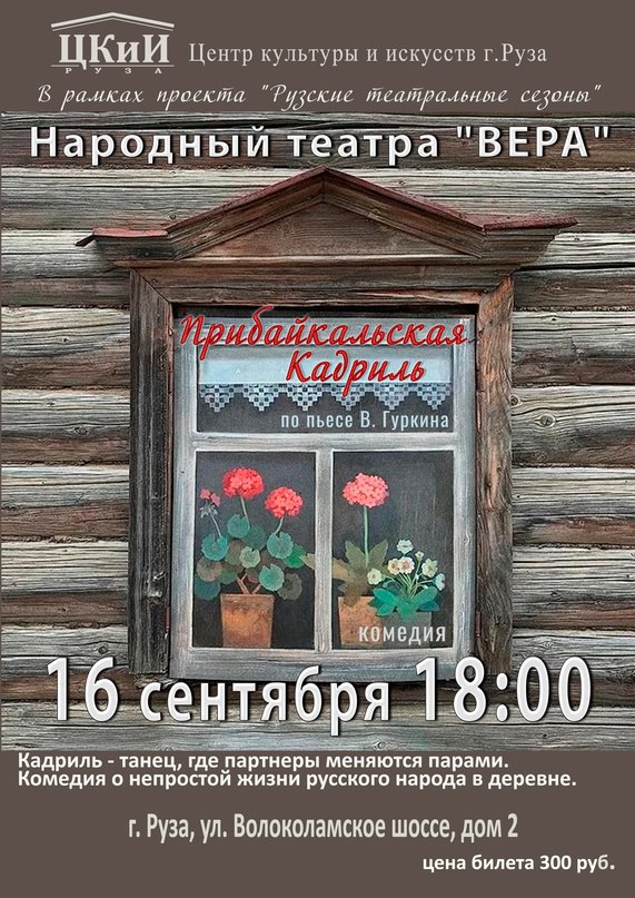 16 сентября в 18.00 в рамках проекта зрители увидят комедию от народного театра "ВЕРА" "Прибайкальская кадриль" по пьесе В. Гуркина. Цена билета 300 рублей.