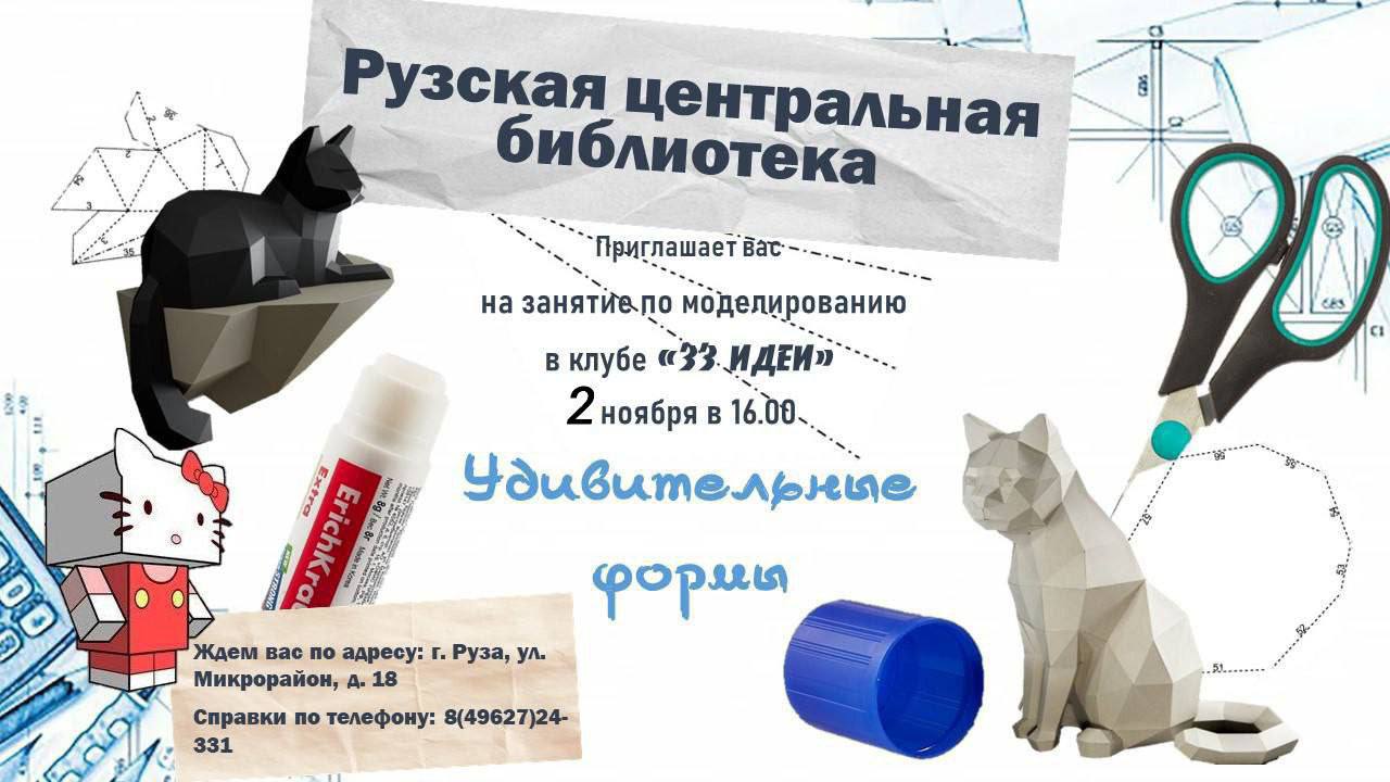 2 ноября в Рузской центральной библиотеке состоится открытие нового клуба «33 идеи», участники которого попробуют себя в моделировании. Первое занятие под названием «Удивительные формы» – уже завтра в 16 часов. Приходите – будет интересно!
