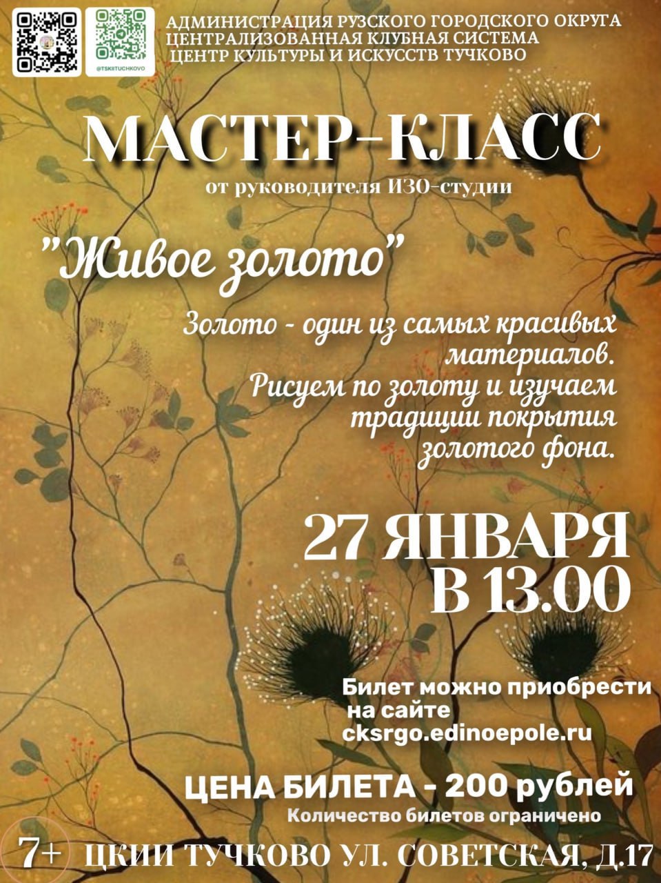 27 января в Тучковском центре культуры и искусств состоится мастер-класс «Живое золото» от руководителя изостудии.