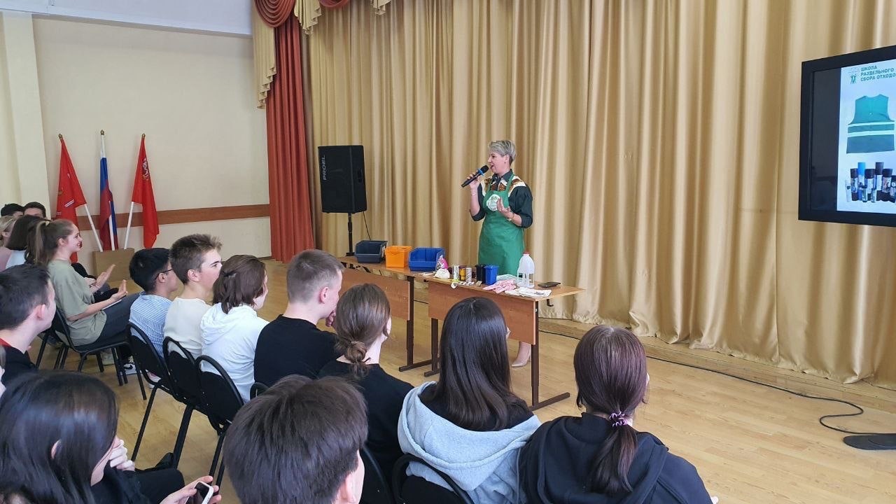 Руководитель ресурсного центра Рузского городского округа Надежда Квасова провела в формате образовательного стендапа для девятиклассников гимназии №1 Рузы эколого-просветительское занятие «Раздельный сбор отходов –
