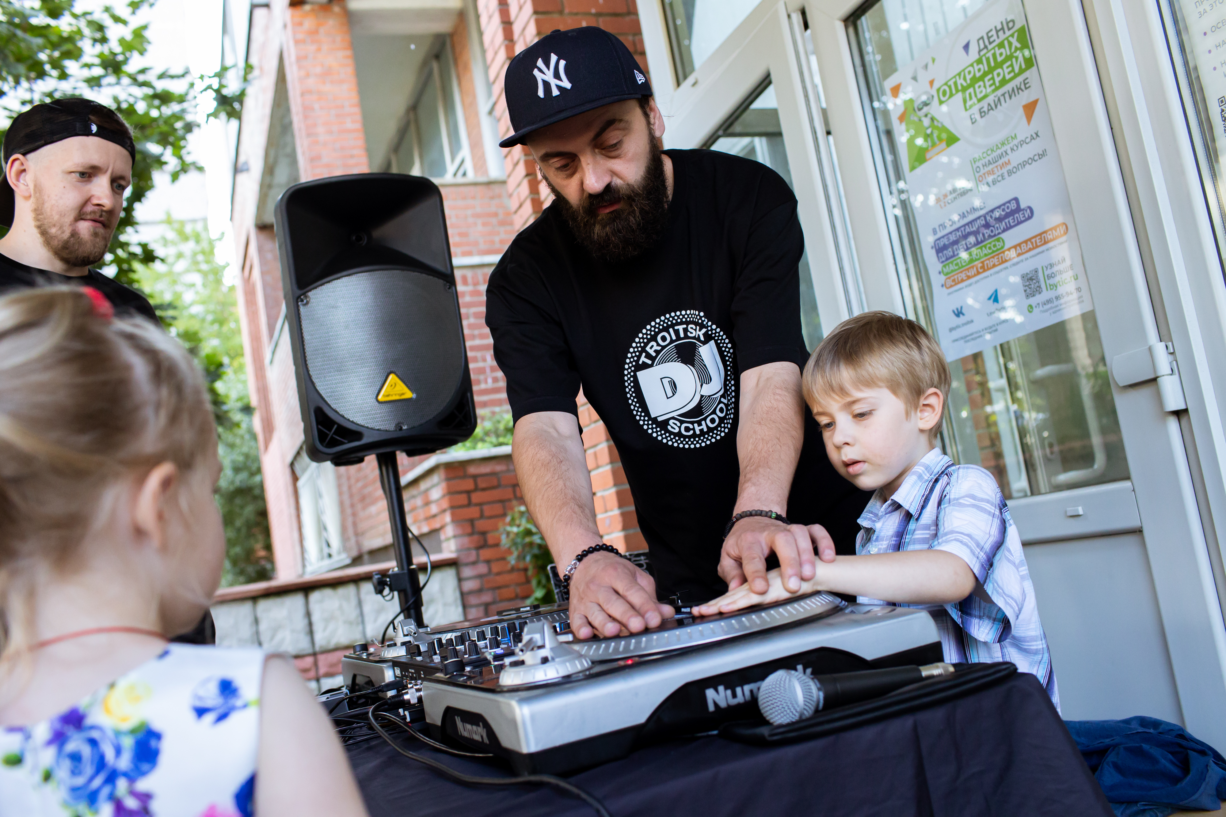 Праздник слышен издалека. Громко играет музыка, у самого входа расположилась профессиональная музыкальная установка с виниловым проигрывателем, за которой под руководством преподавателей троицкой школы диджеев колдуют дети. Сегодня им показывают, как можно совместить два трека, чтобы они интересно звучали, чтобы одна мелодия переходила в другую и наоборот. Дают возможность прикоснуться к музыке и почувствовать, как ею можно управлять. «Мы преподаём в «Байтике», – поясняет Сергей Жмур. – У нас занятия по созданию музыки и по диджеингу. Дети учатся создавать музыку, писать её, редактировать – всё это на профессиональном оборудовании».