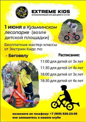 1 июня в Кузьминском лесопарке (возле детской площадки) мультиспортивный клуб EXTREME KIDS будет проводить бесплатные мастер-классы «Гонки на беговелах».