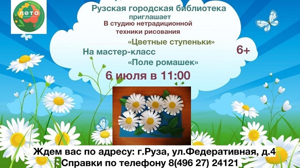 Мастер-класс «Поле ромашек» состоится 6 июля в 11 часов в студии нетрадиционной техники рисования «Цветные ступеньки» Рузской городской библиотеки.