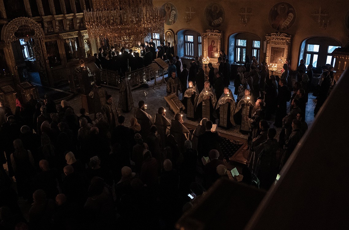 Соборно предстоя Кресту Христову с возжженными в руках свечами, духовенство и народ предваряют в нынешний вечер богослужения Великой Пятницы.