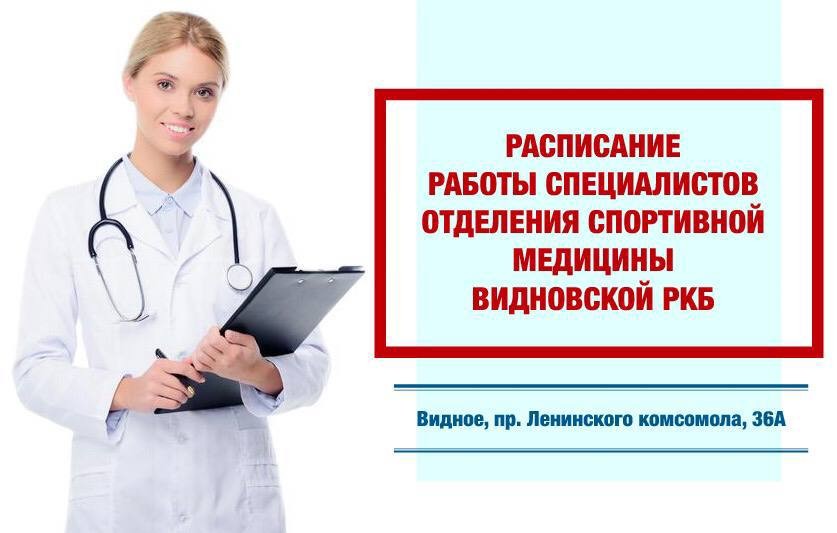 Отделение спортивной медицины Видновской РКБ продолжает свою работу. Сегодня мы публикуем график работы отделения на следующую неделю и уточняем порядок записи на прием к врачам и порядок обследований.