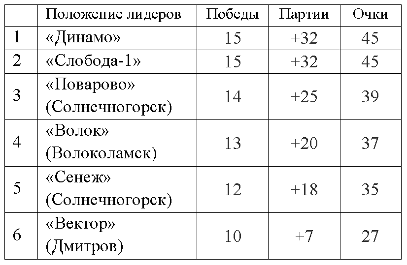 Ситуация в открытом первенстве Клина такова, что почти в каждом туре зрители видят суперматчи. 19 февраля пиршеством для болельщиков стала встреча «Поварова» и «Слободы-1». Такая игра не могла не растянуться на 5 сетов. Сначала две партии остаются за «Поваровым»: 25:23, 25:15. Потом побеждает «Слобода-1»: 19:25, 22:25. Но на тай-брейке сильнее выглядит «Поварово – 15:6. Результаты остальных встреч 17-го тура: «Вектор» — ВК «50+» 3:0 (25:12, 25:15, 25:17); «Высоковск» — «Волок» 1:3 (20:25, 25:22, 20:25, 17:25); «Динамо» — «СВ» 3:0 (25:23, 25:17, 25:23); «Викинг» — «Сенеж» 0:3 (14:25, 18:25, 15:25); «Слобода-2» — «Спас-Заулок» 2:3 (23:25, 25:21, 15:25, 25:17, 11:15).