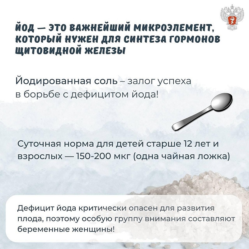 Профилактика заболеваний щитовидной железы во многом основывается на рациональном питании — в частности, достаточном потреблении йода. Его можно получить, употребляя в пищу йодированную соль и минимум трижды в неделю есть продукты с высоким содержанием йода (особенно морепродукты – морскую капусту, хурму, финики, фейхоа, креветки, рыбу и т.д). Йодированная соль — это обычная поваренная соль, в состав которой химическим путем добавлен йодат или йодид калия, а стоимость такой соли лишь на 10% превышает стоимость обычной соли. Рекомендованное количество йода в сутки для взрослого человека составляет 200 мкг, а для беременных женщин 250 мкг.